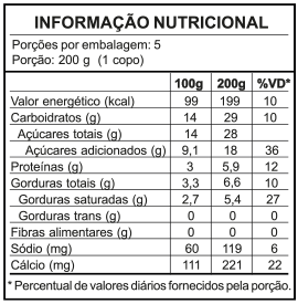 Leite integral, açúcar refinado, preparado de morango (água, açúcar líquido invertido, polpa de morango, amido modificado, aroma idêntico ao natural de morango, acidulante ácido cítrico, conservante sorbato de potássio e corantes artificiais azorrubina, ponceau e azul brilhante) e fermento lácteo.